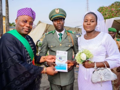 « Se marier, c’est rendre l’autre heureux. De tout ce qui a été dit, retenez tout simplement que se marier, c’est rendre l’autre heureux…En cas de crise, la communication est de mise…En cas de crise, il y a le devoir de s’assoir pour parler et remplir la condition d’écoute et de confiance », a dit le parrain de l’événement qui a prié pour que le lien qui vient d’être scellé par le Maire ne se dénoue jamais devant le juge…