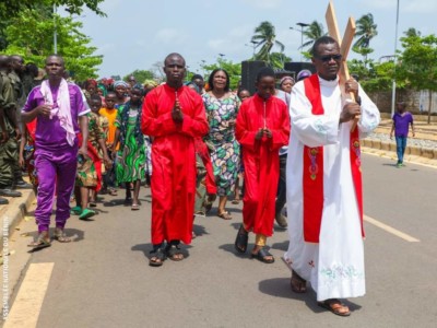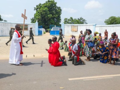 vécu à travers le chemin de croix et l’évangile, la passion du Christ. Ce chemin de croix leur a permis d’observer 14 stations (arrêts suivis de prières) sur les notes de la chorale « Sèhouégnon » suivant l’itinéraire ci-après : Eglise Sainte Geneviève-Ancien cimetière de Porto-Novo-École nationale de la Police Républicaine-Station Bio Guera-Eglise Sainte Geneviève.