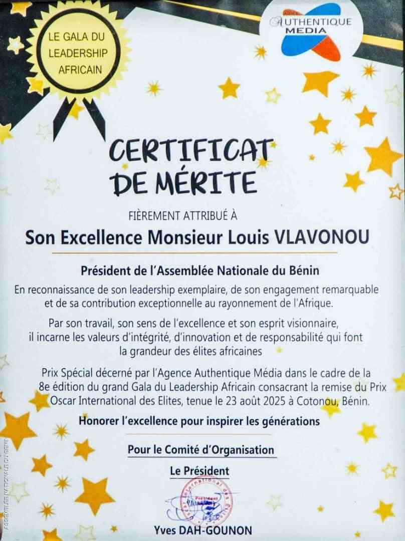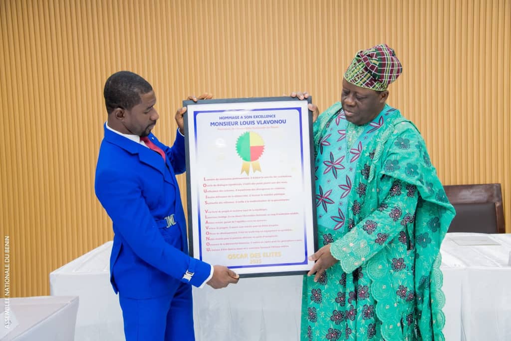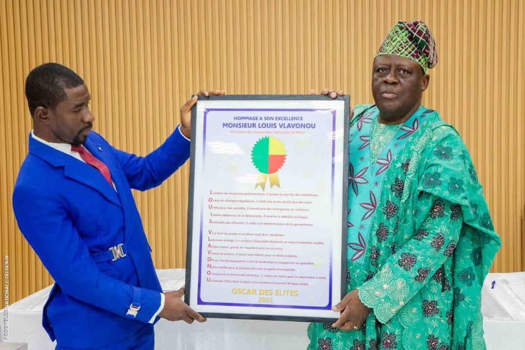Dix jours seulement après le titre de Docteur Honoris Causa que lui a décerné l’Université protestante de l’Afrique de l’Ouest, le Président de l’Assemblée nationale du Bénin, Louis Gbèhounou Vlavonou, a reçu ce lundi 13 octobre 2025 au Palais des Gouverneurs le Prix spécial « Leadership d’excellence au service de la Nation et de Meilleur Président d’institutions du Bénin ». Ledit prix lui a été remis par Yves Dah-Gounon, Président du Comité d’organisation du Prix Oscar international des Élites. C’était en présence de quelques membres de la Conférence des Présidents de l’Assemblée nationale, puis des cadres et responsables à divers niveaux du Parlement.