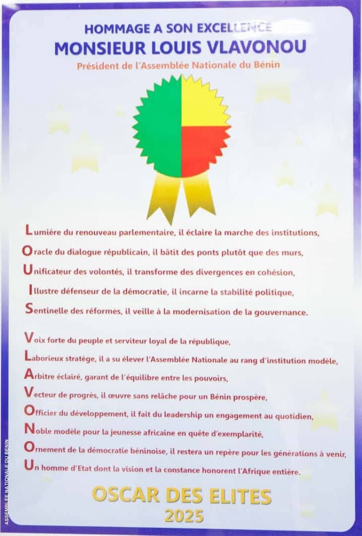 Outre ses collègues députés, le Président Louis Gbèhounou Vlavonou a dédié sa distinction à tous ceux qui, dans la discrétion des bureaux et le silence du travail bien fait, ont contribué à bâtir cette Assemblée performante et plus respectée. Il n’a pas oublié le personnel administratif, civil et militaire, dont le professionnalisme honore chaque jour le Parlement béninois ; ses collaborateurs, compagnons de chaque instant, dont la compétence et la loyauté l’accompagnent dans toutes ses missions ; puis enfin les partenaires techniques et financiers qui soutiennent les courageuses réformes engagées avec constance et confiance.