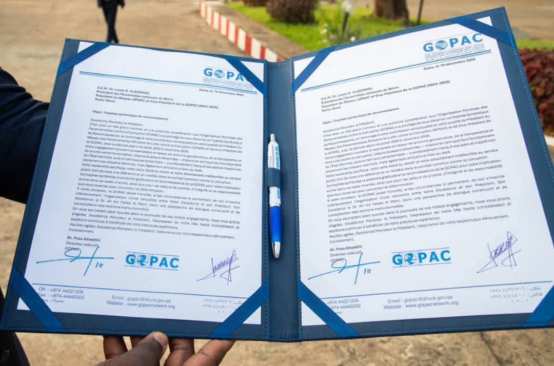 Le Président de l’Assemblée Nationale du Bénin a reçu dans la matinée de ce lundi 19 janvier 2026 une distinction honorifique que lui a décernée l’Organisation mondiale des parlementaires contre la corruption (GOPAC). C’était en marge de la traditionnelle cérémonie des couleurs à laquelle le personnel civil et militaire s’est désormais habitué depuis le début de la 8è législature. Ladite distinction qui vient succéder à celle qui lui a été déjà décernée par le Réseau des parlementaires africains pour la lutte contre la corruption (APNAC) lui a été remise par Fabrice Fofonsi, Directeur exécutif de l’APNAC.