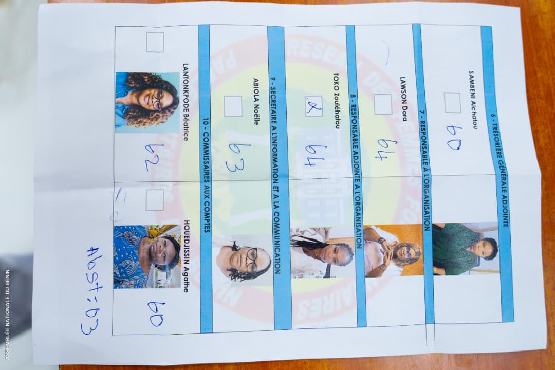 Après le discours d’ouverture, s’en est suivie une remise de distinctions honorifiques aux membres sortants du bureau, puis l’élection du nouveau bureau. À l’issue du scrutin, Mme Vioutou Esther AKPLOGAN Vioutou a été élue présidente du RFFP-Bénin avec un total de 65 voix sur 73 votants. Les autres membres du bureau sont : Mme CHANOU Fayikoth (vice-présidente), Mme ADJAHOUN Blandine (Secrétaire générale), Mme AFOUDA Naomie (Secrétaire générale adjointe), Mme ABOUDOU Rafiatou (Trésorière générale), Mme SAMBIENI Aïchatou (Trésorière générale adjointe), Mme LAWSON Dora (Responsable à l’organisation), Mme TOKO Zouléhatou (Responsable adjointe à l’organisation) et Mme ABIOLA Noélie (Secrétaire à l’information et à la communication).